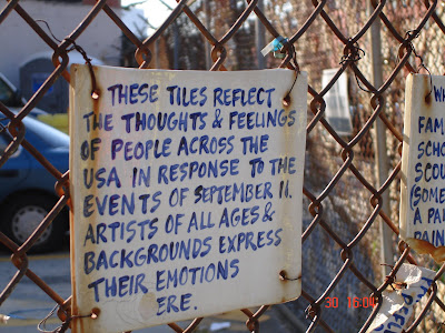 Eric and I had been to The Village (we talk like locals now!) earlier in the day, for his appointment to try out some upright basses at a specialist store called David Gage, check out this showroom (I'm a regular undercover photographer now) and on our walk there I particularly liked this collection of tiles painted by locals after 9/11, some had really poignant messages on them.